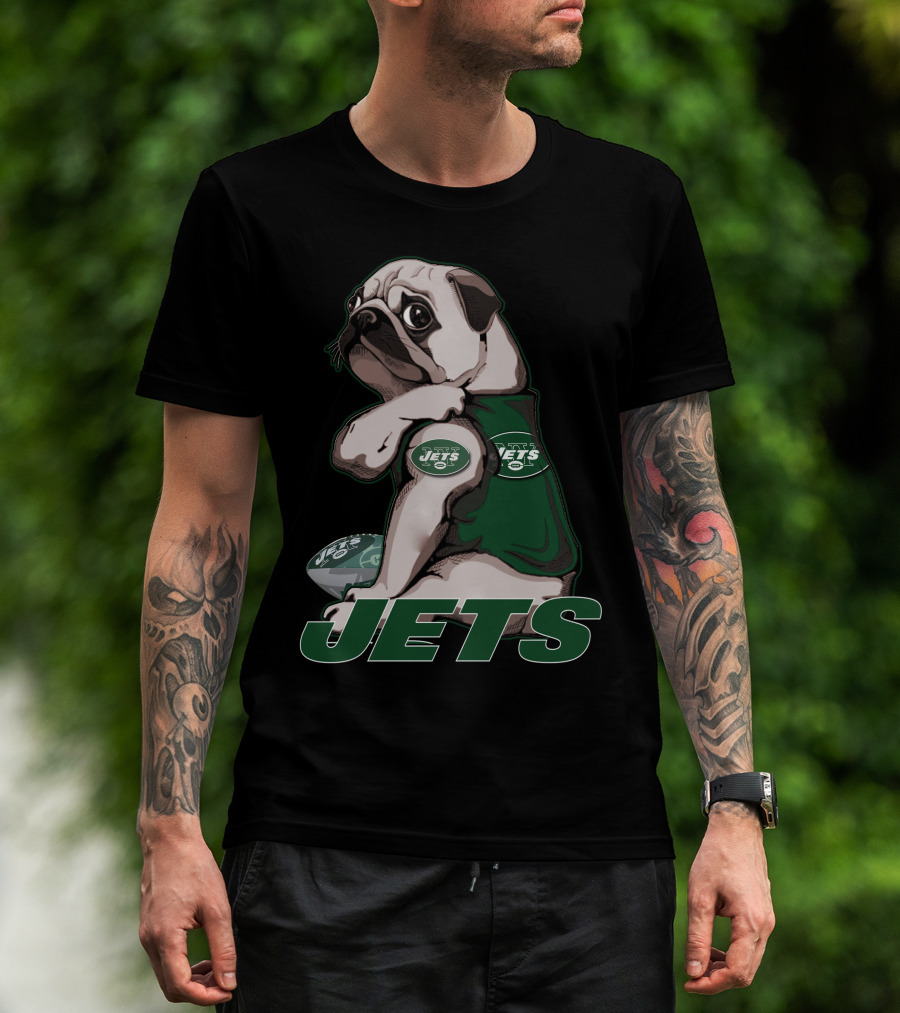 The Pug Jets New York Football Fan T-shirt is designed for everyday wear and a consistent fit. Fabric is pre-shrunk ring-spun cotton with durable stitching. See the size chart below for exact measurements.