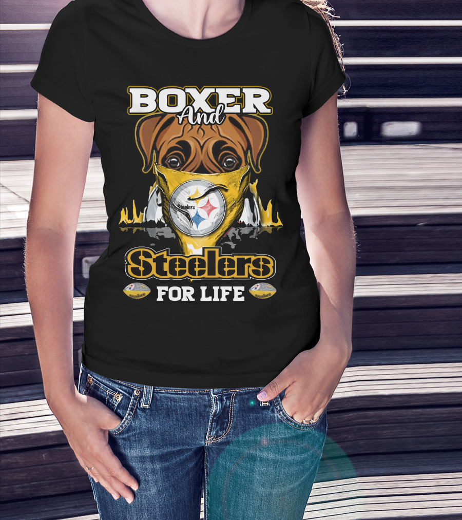 The Boxer and Steelers for Life T-shirt is designed for everyday wear and a consistent fit. Fabric is pre-shrunk ring-spun cotton with durable stitching. See the size chart below for exact measurements.