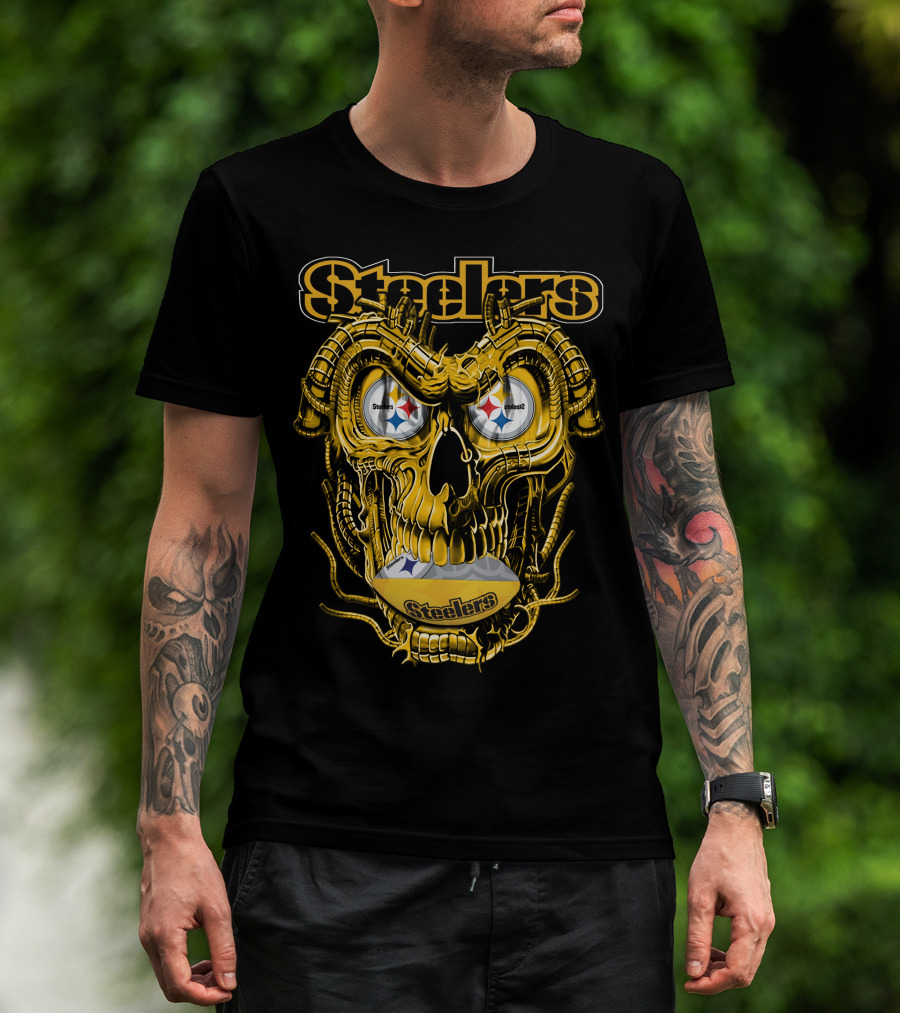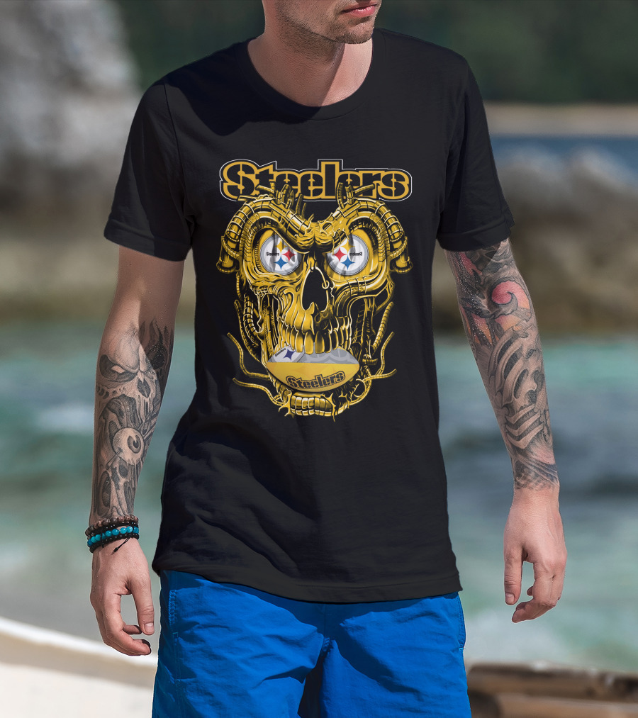 Steelers Dragonskull Yellow Mechanical Skull With Pittsburgh Steelers Logo Eyes T-Shirt