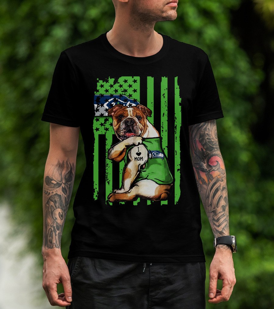 Bulldog I Love Mom Seattle Seahawks American Flag T-Shirt
