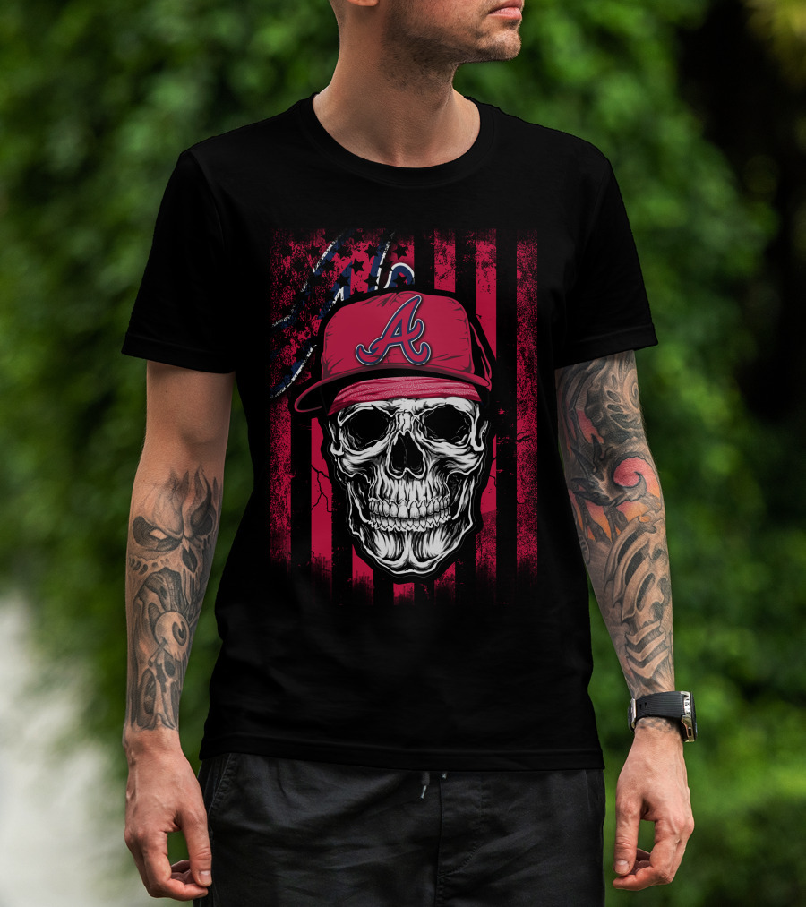 The Skull with Atlanta Braves Hat on T-shirt is designed for everyday wear and a consistent fit. Fabric is pre-shrunk ring-spun cotton with durable stitching. See the size chart below for exact measurements.