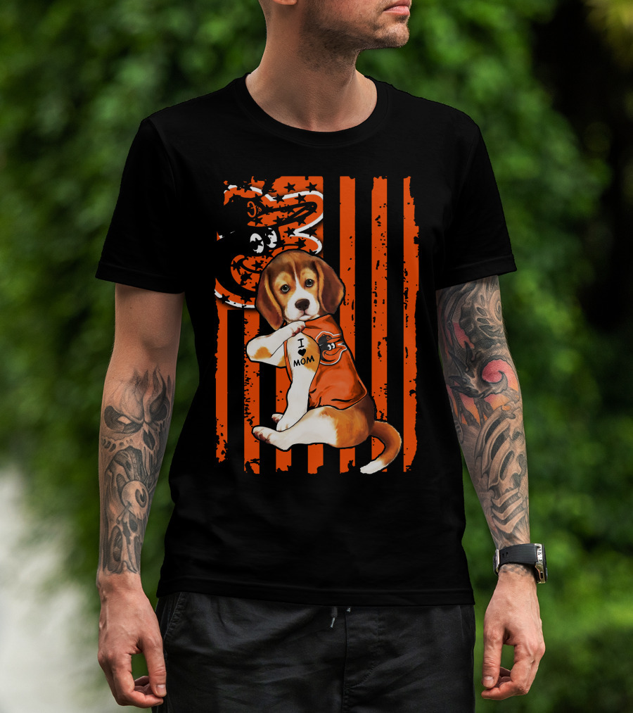 Beagle In Baltimore Orioles Orange With I Love Mom Tattoo And Stars And Stripes Background T-Shirt