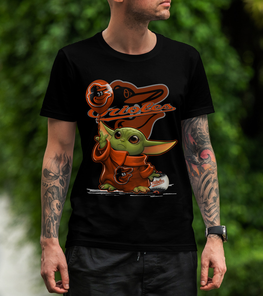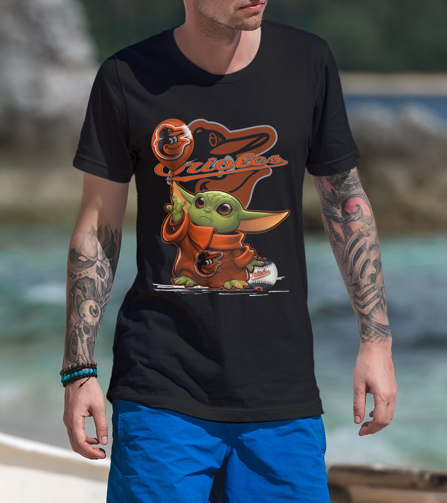 Yoda Holding Baltimore Orioles Balloon With Logo And Baseball T-Shirt