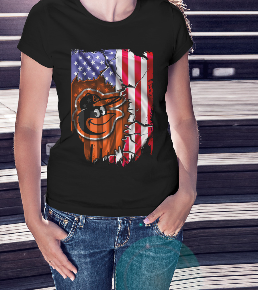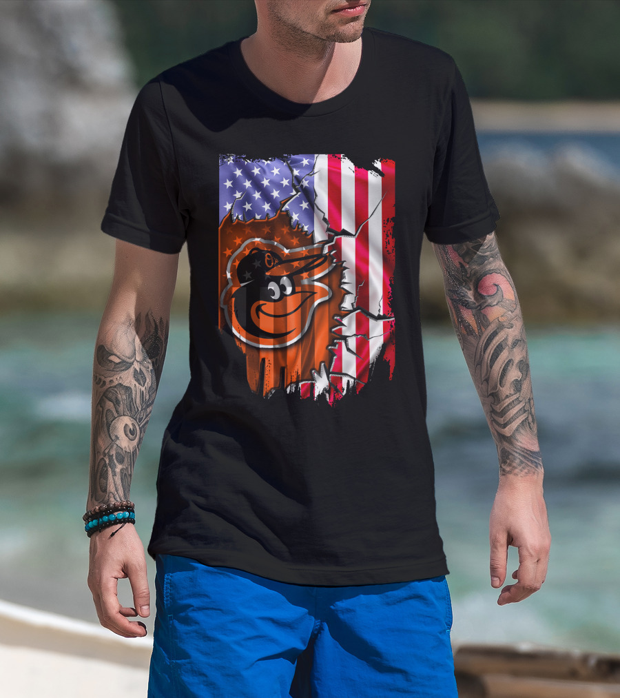 The American Flag Baltimore Orioles T-shirt is designed for everyday wear and a consistent fit. Fabric is pre-shrunk ring-spun cotton with durable stitching. See the size chart below for exact measurements.