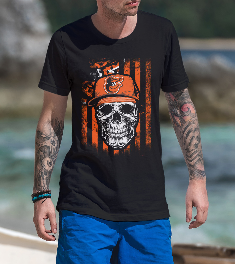 Baltimore Orioles Skull With Logo Cap T-Shirt
