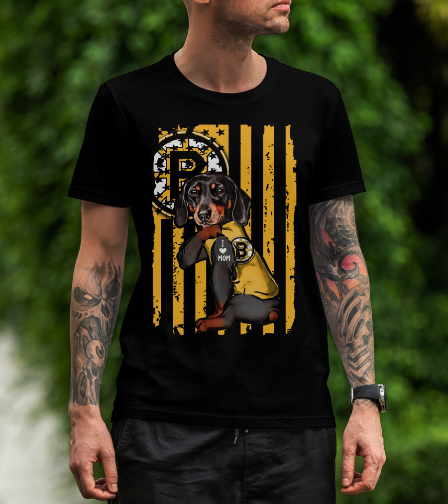 Dachshund I Love Mom Boston Bruins Stripes T-Shirt