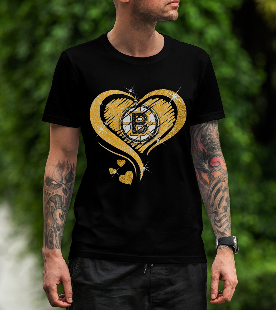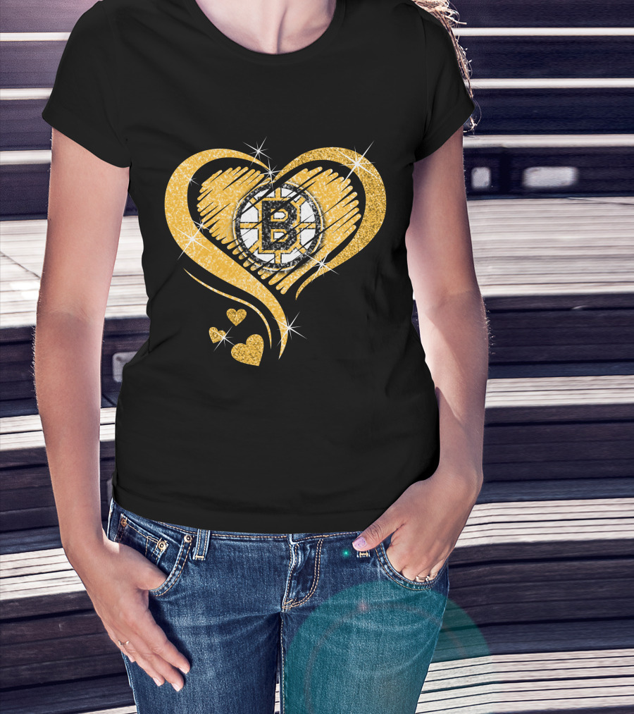 Boston Bruins Heart Glitter Logo Diamond T-Shirt