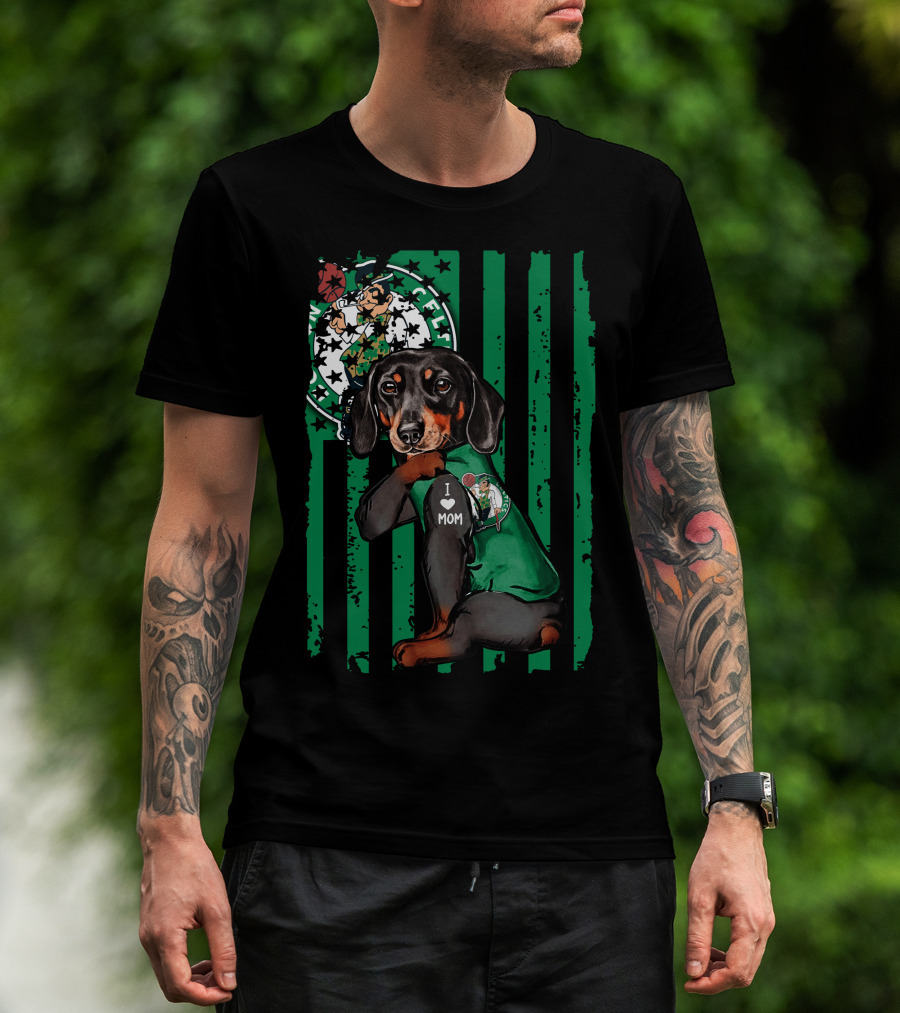 Dachshund Wearing I Love Mom Shirt With Boston Celtics Logo And Mascot T-Shirt