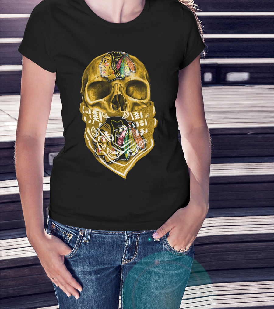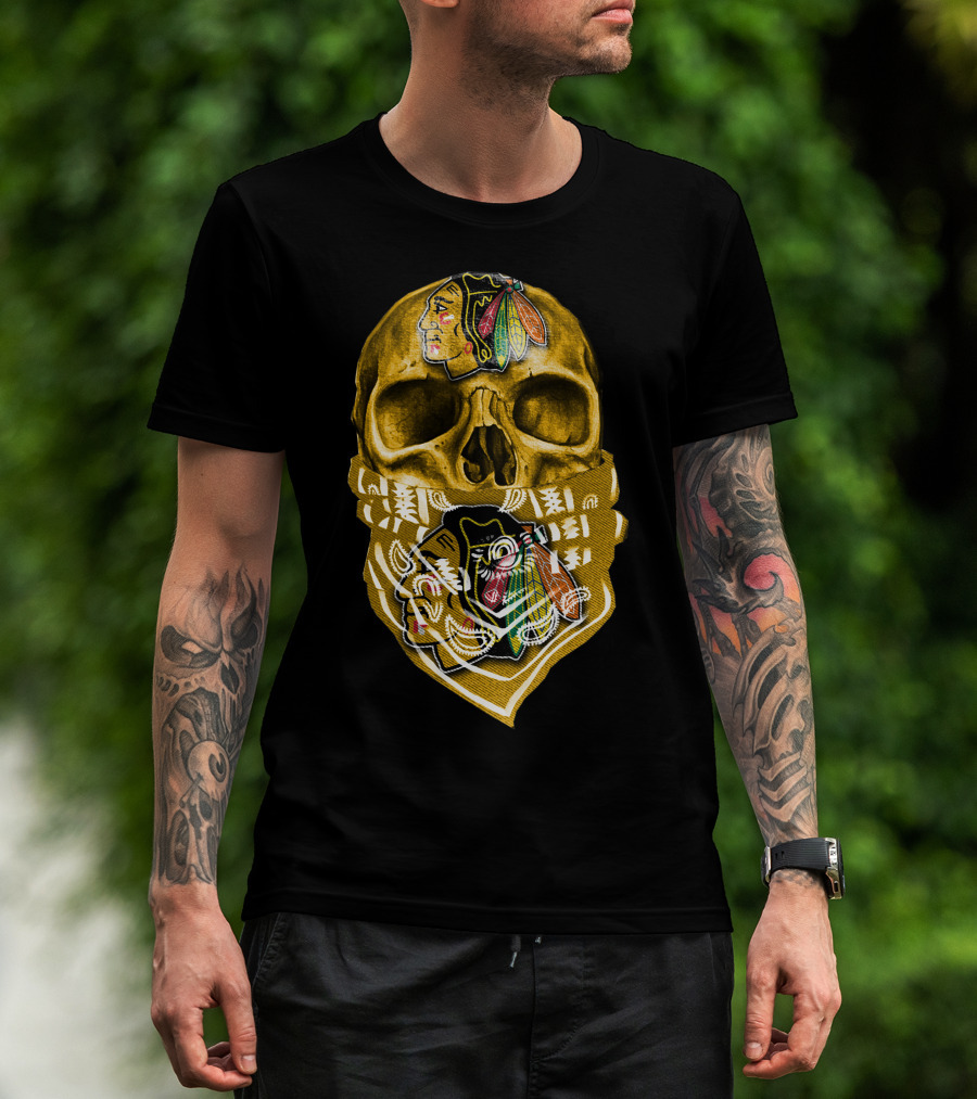 Skull With Chicago Blackhawks Logo Bandana T-Shirt
