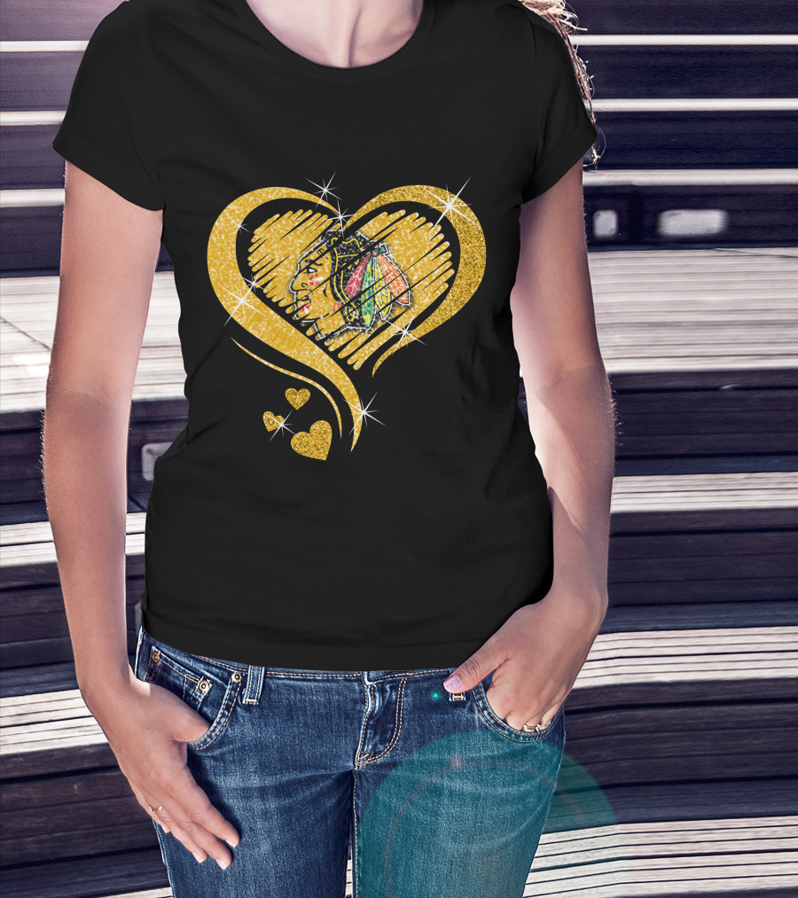 The Heart Glitter Chicago Blackhawks T-shirt is designed for everyday wear and a consistent fit. Fabric is pre-shrunk ring-spun cotton with durable stitching. See the size chart below for exact measurements.
