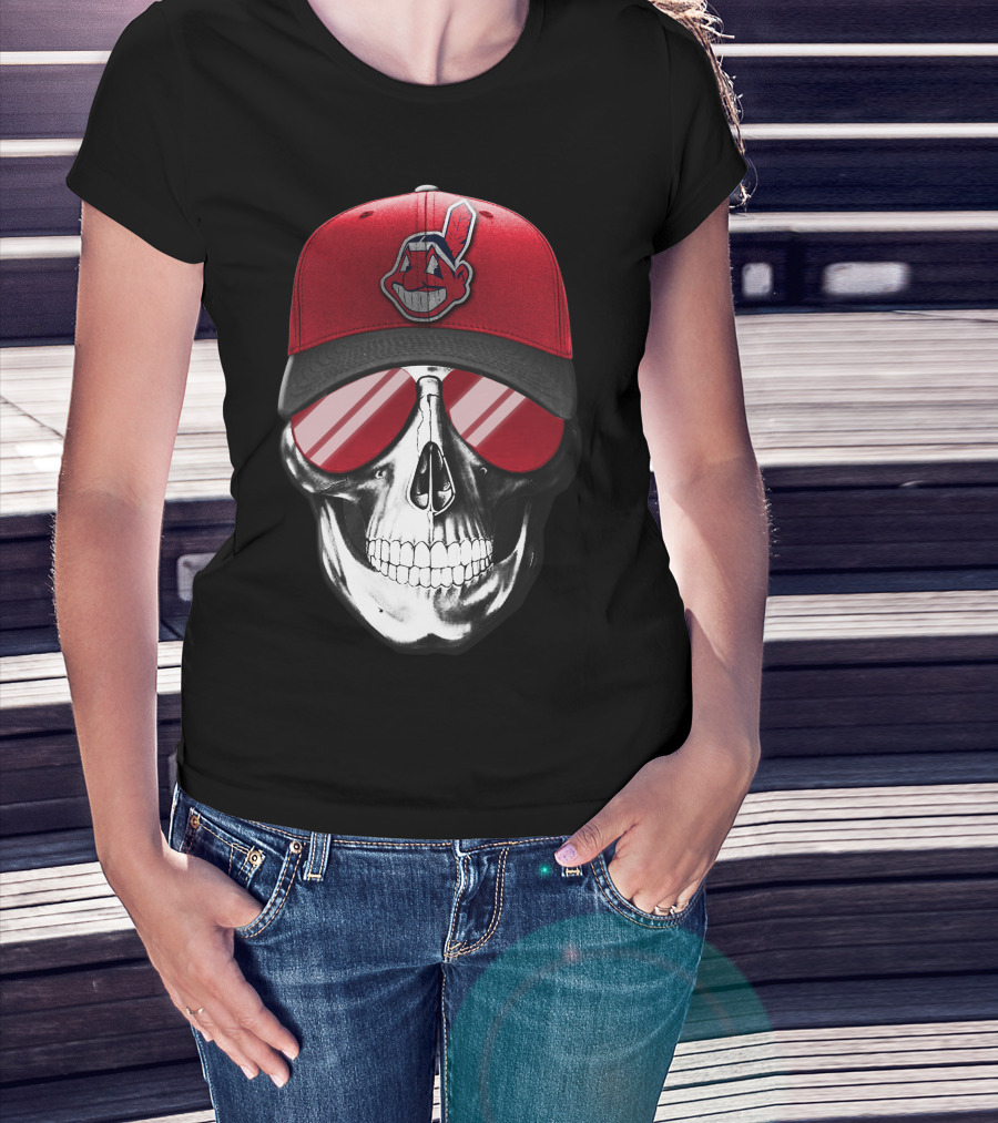 Skull With Cleveland Indians Cap And Sunglasses T-Shirt