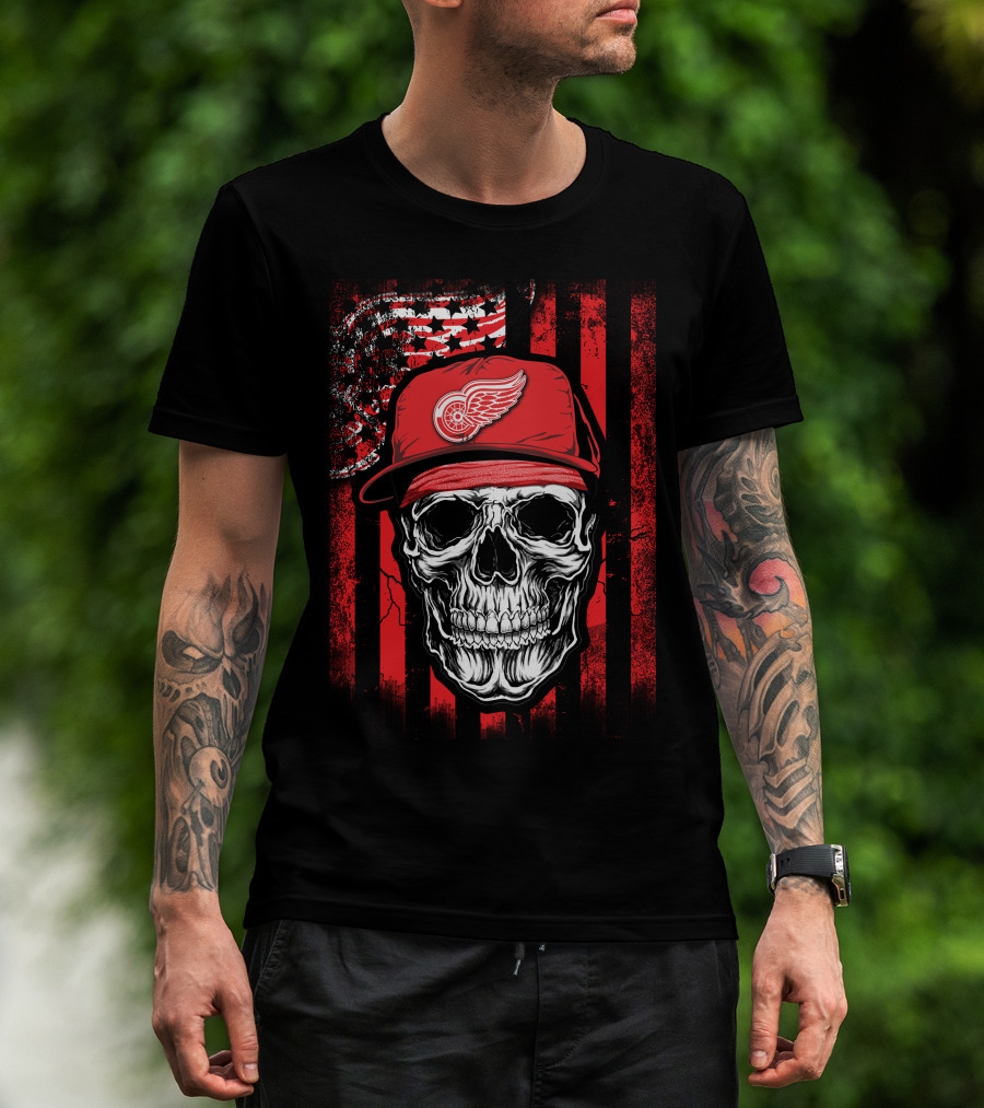 Skull Detroit Red Wings American Flag Hat T-Shirt