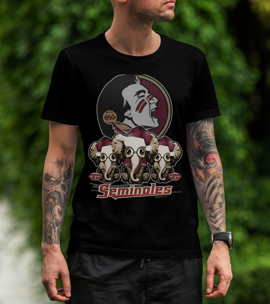 Seminoles Florida State Xmas Elephan With Santa Hats And Eyeglasses T-Shirt