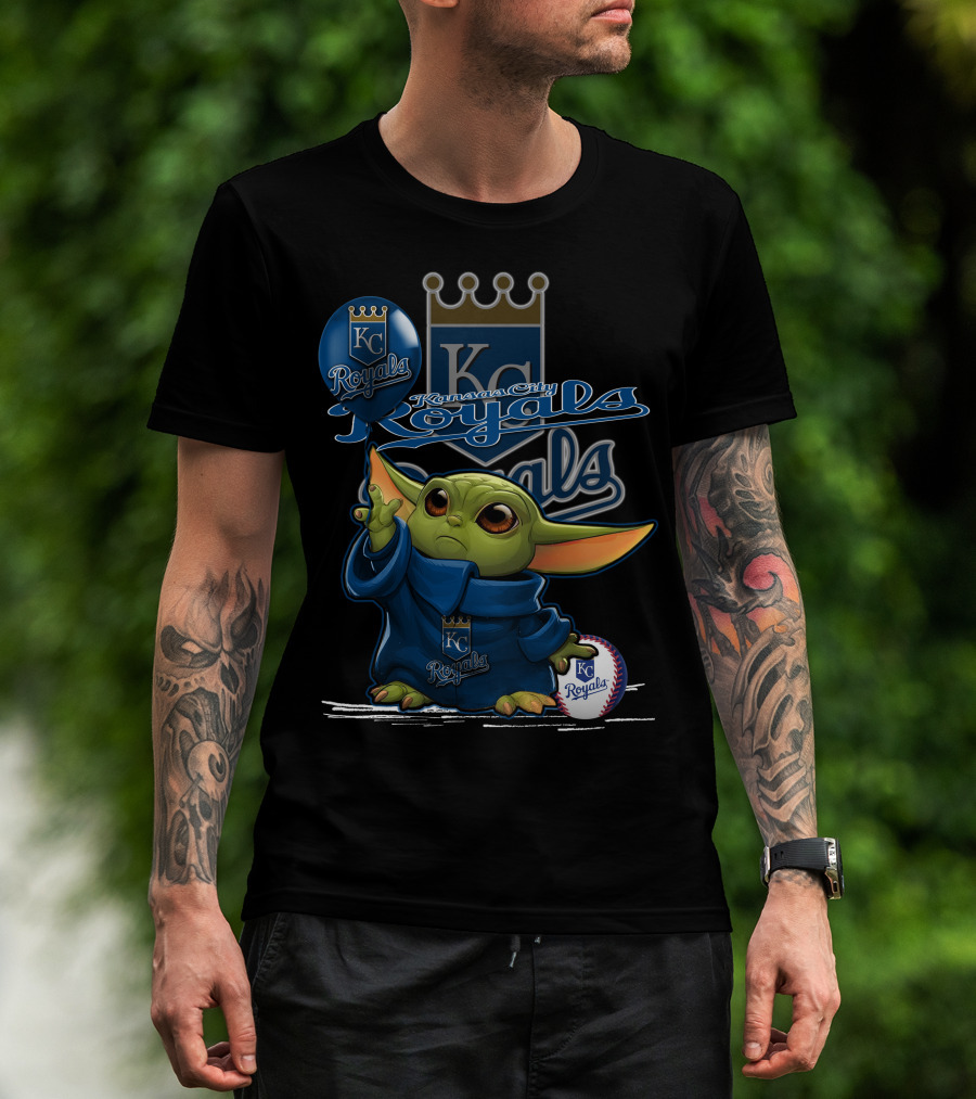 The Yoda Kansas City Royals Holding KC Ball and Balloon T-shirt is designed for everyday wear and a consistent fit. Fabric is pre-shrunk ring-spun cotton with durable stitching. See the size chart below for exact measurements.