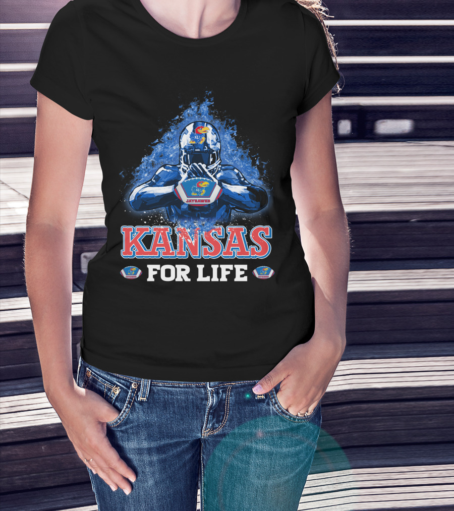 The Kansas Jayhawks Football For Life T-shirt is designed for everyday wear and a consistent fit. Fabric is pre-shrunk ring-spun cotton with durable stitching. See the size chart below for exact measurements.