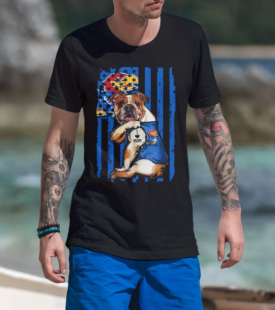 Bulldog Wearing Kansas Jayhawks I Love Mom Tattoo With Blue Stripes And Jayhawk T-Shirt