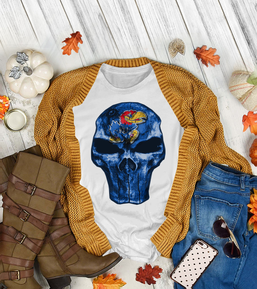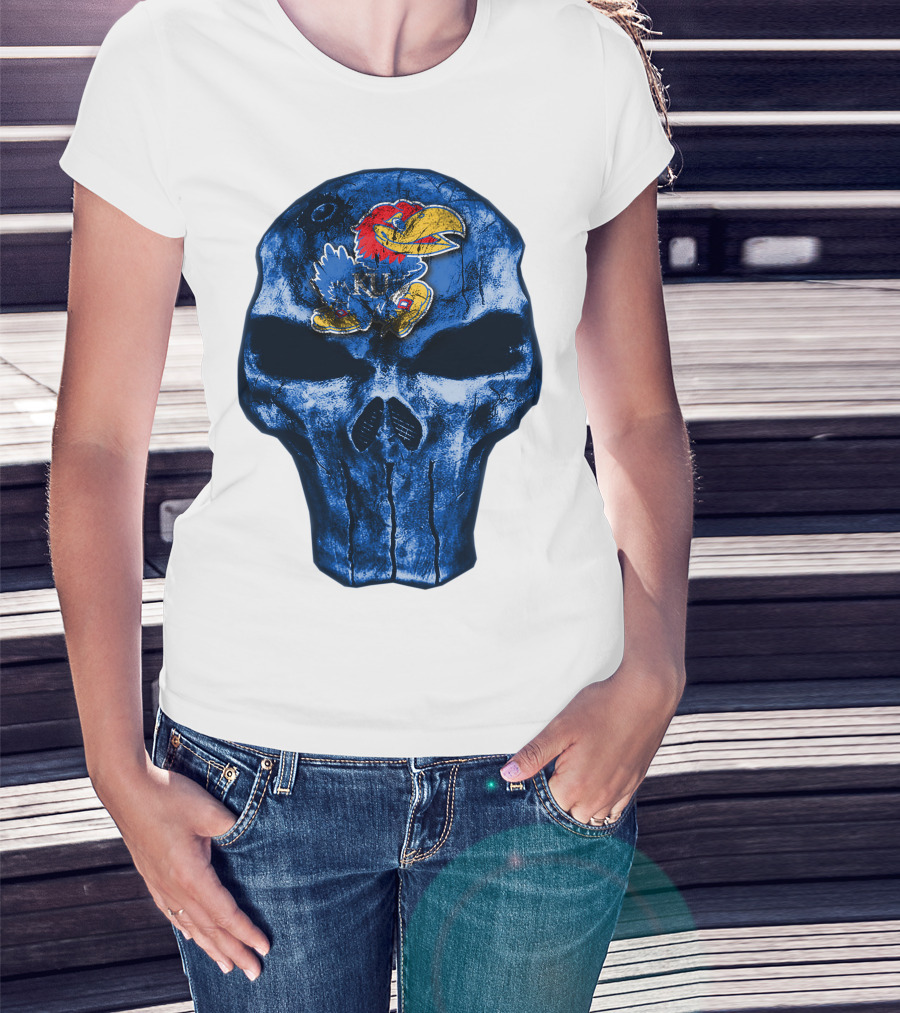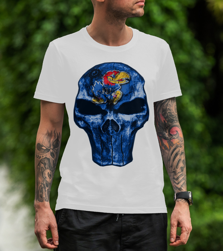 Kansas Jayhawks Logo On Blue Skull T-Shirt