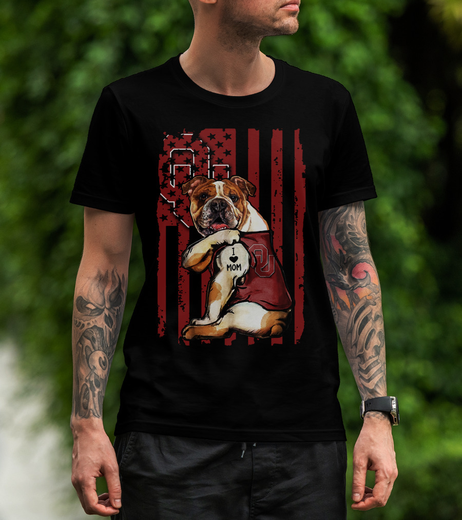 Bulldog With Oklahoma Sooners Love For Mom In American Flag T-Shirt