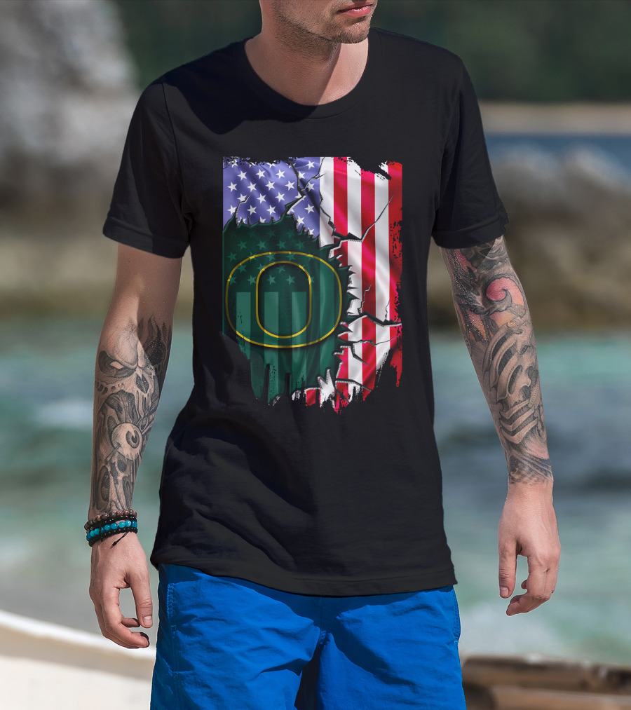 The American Flag Oregon Ducks T-shirt is designed for everyday wear and a consistent fit. Fabric is pre-shrunk ring-spun cotton with durable stitching. See the size chart below for exact measurements.