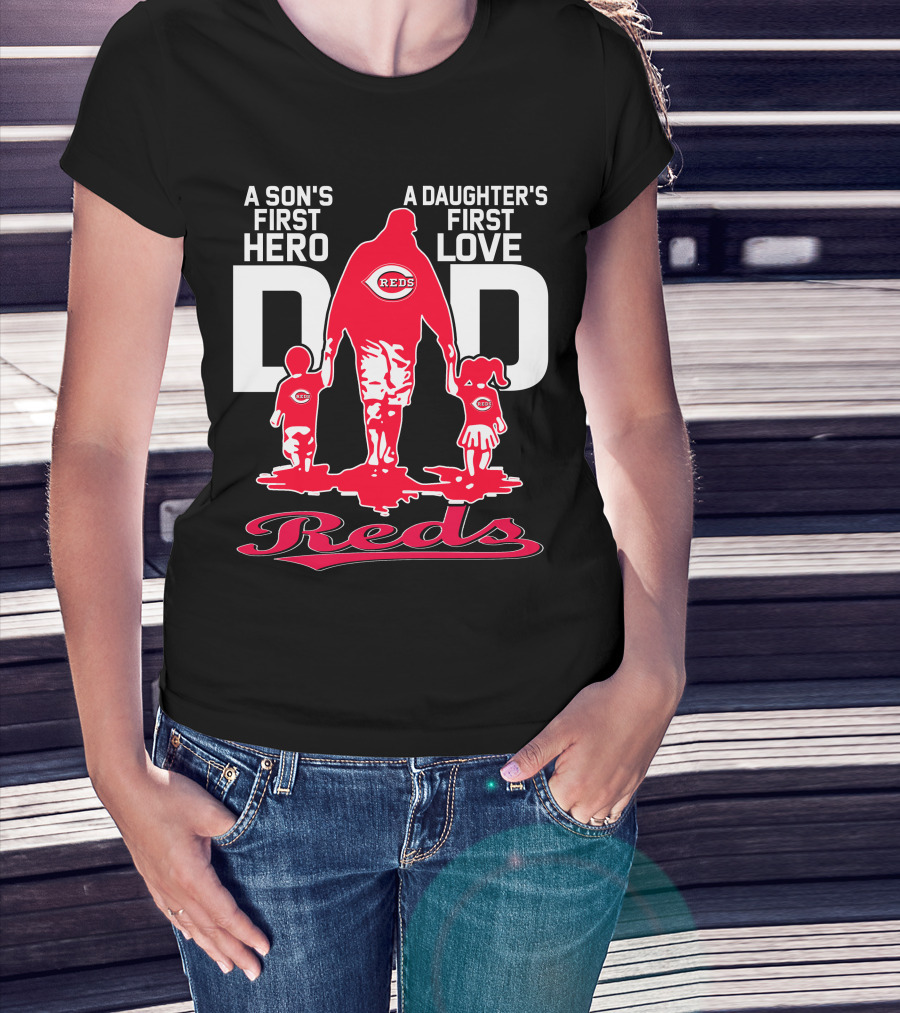 The A Son's First Hero A Daughter's First Love Dad Reds T-shirt is designed for everyday wear and a consistent fit. Fabric is pre-shrunk ring-spun cotton with durable stitching. See the size chart below for exact measurements.