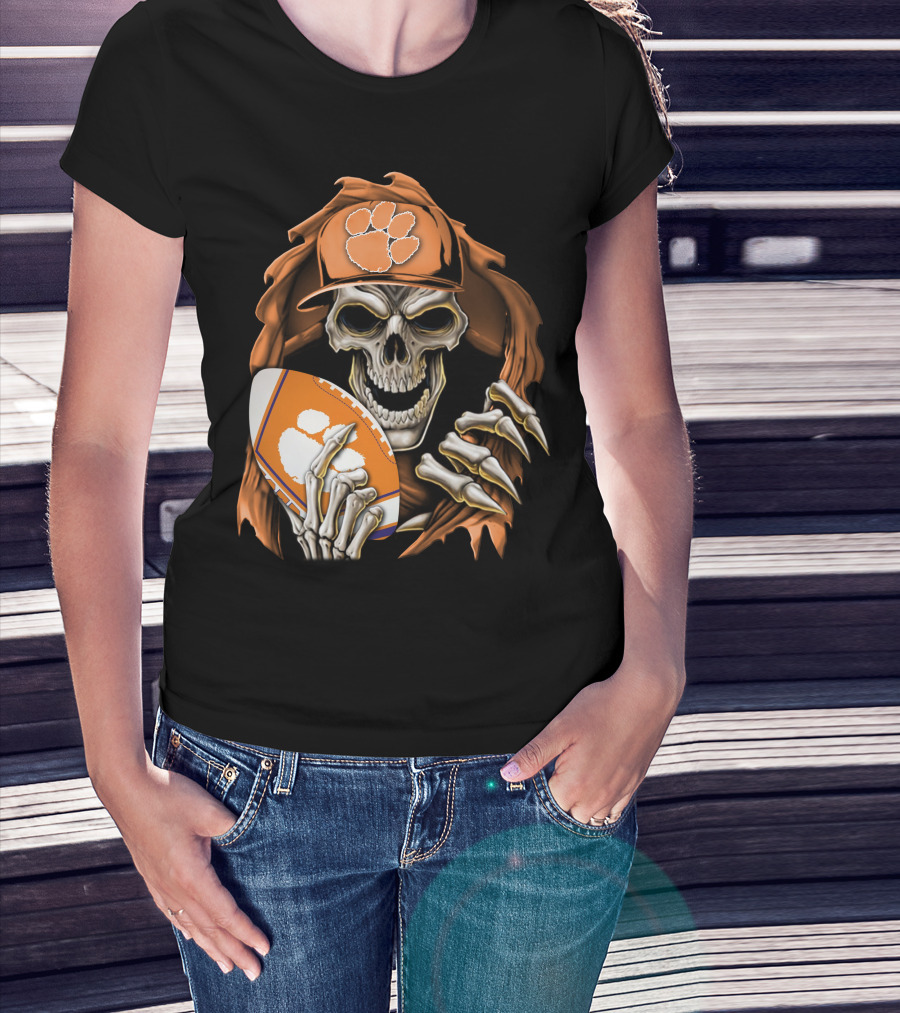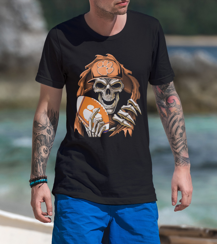 Skullbong Clemson Tigers Skeleton In Hat Holding Football T-Shirt