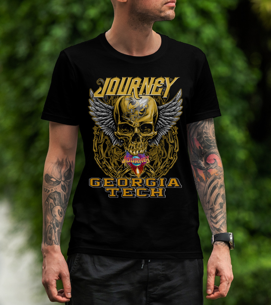 The Journey Georgia Tech Skull Wings T-shirt is designed for everyday wear and a consistent fit. Fabric is pre-shrunk ring-spun cotton with durable stitching. See the size chart below for exact measurements.