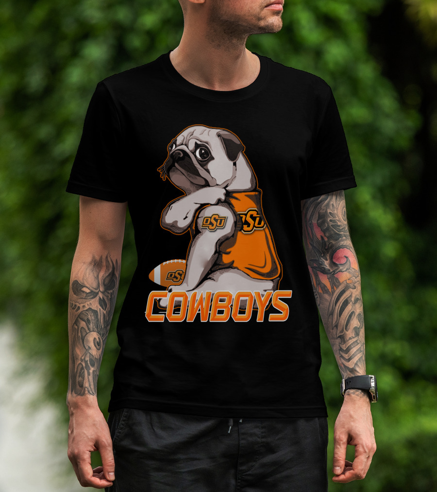 The OSU Pug with Football and Cowboys Text T-shirt is designed for everyday wear and a consistent fit. Fabric is pre-shrunk ring-spun cotton with durable stitching. See the size chart below for exact measurements.