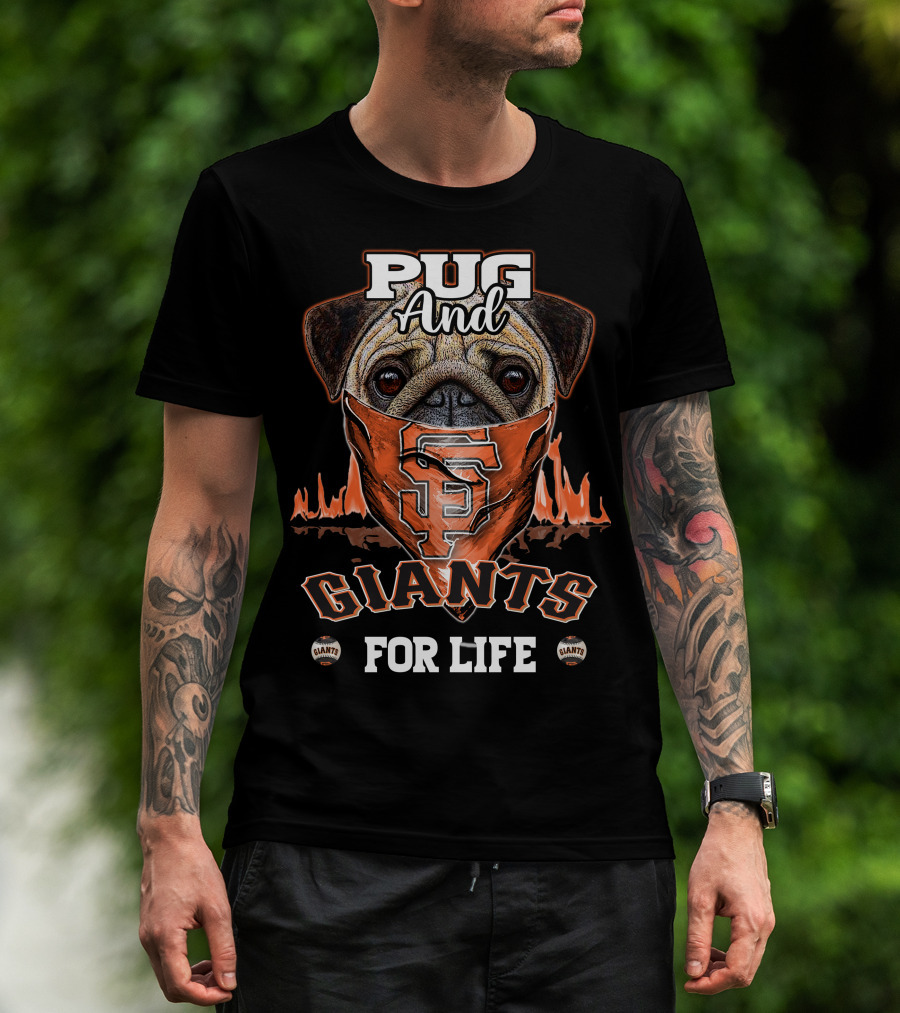 The Pug and San Francisco Giants for Life T-shirt is designed for everyday wear and a consistent fit. Fabric is pre-shrunk ring-spun cotton with durable stitching. See the size chart below for exact measurements.
