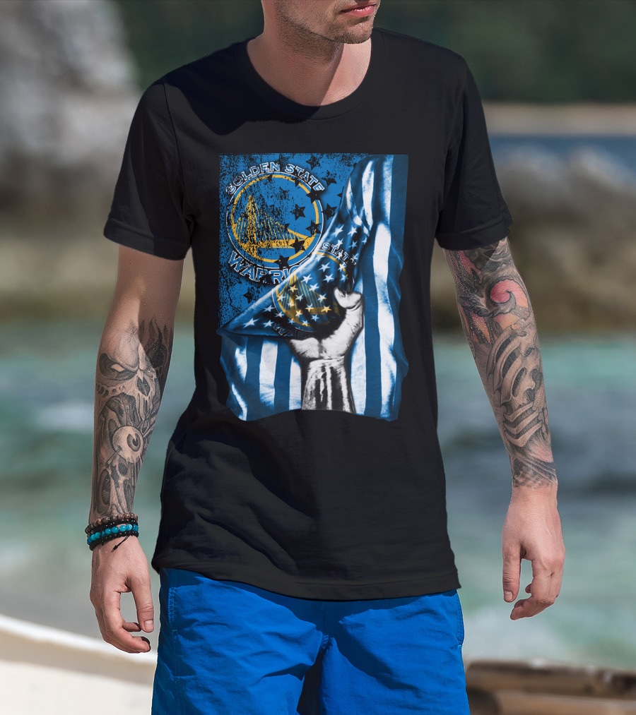 The Golden State Warriors Flag Hand Holding Blue and Gold Stars Stripes T-shirt is designed for everyday wear and a consistent fit. Fabric is pre-shrunk ring-spun cotton with durable stitching. See the size chart below for exact measurements.