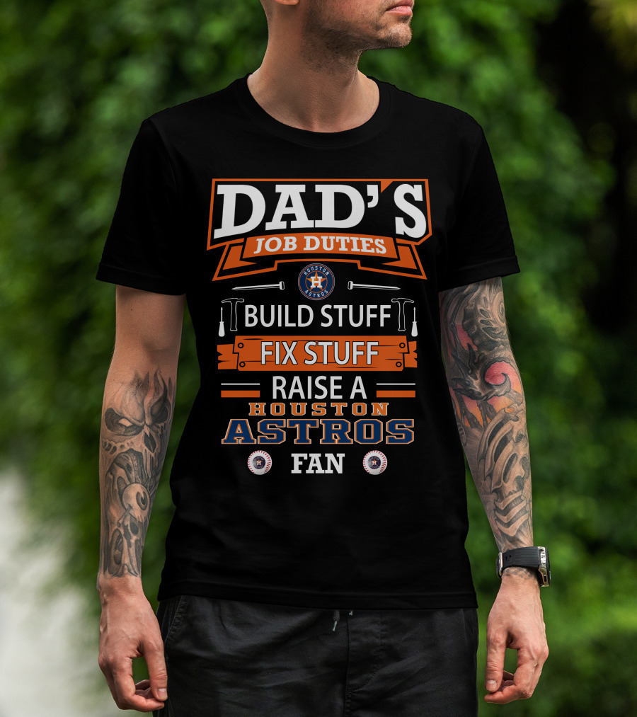 The Dad's Job Duties Houston Astros Build Fix Raise Fan T-shirt is designed for everyday wear and a consistent fit. Fabric is pre-shrunk ring-spun cotton with durable stitching. See the size chart below for exact measurements.