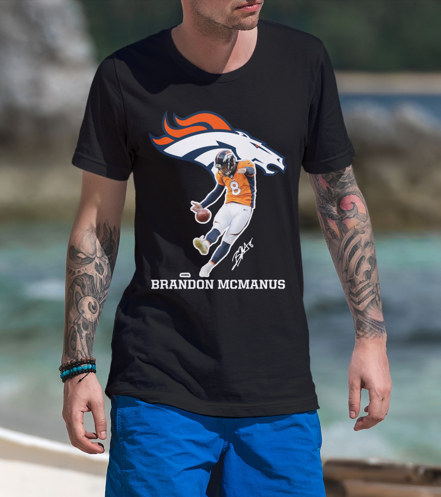 The Denver Broncos Brandon McManus Football Kick Signature T-shirt is designed for everyday wear and a consistent fit. Fabric is pre-shrunk ring-spun cotton with durable stitching. See the size chart below for exact measurements.