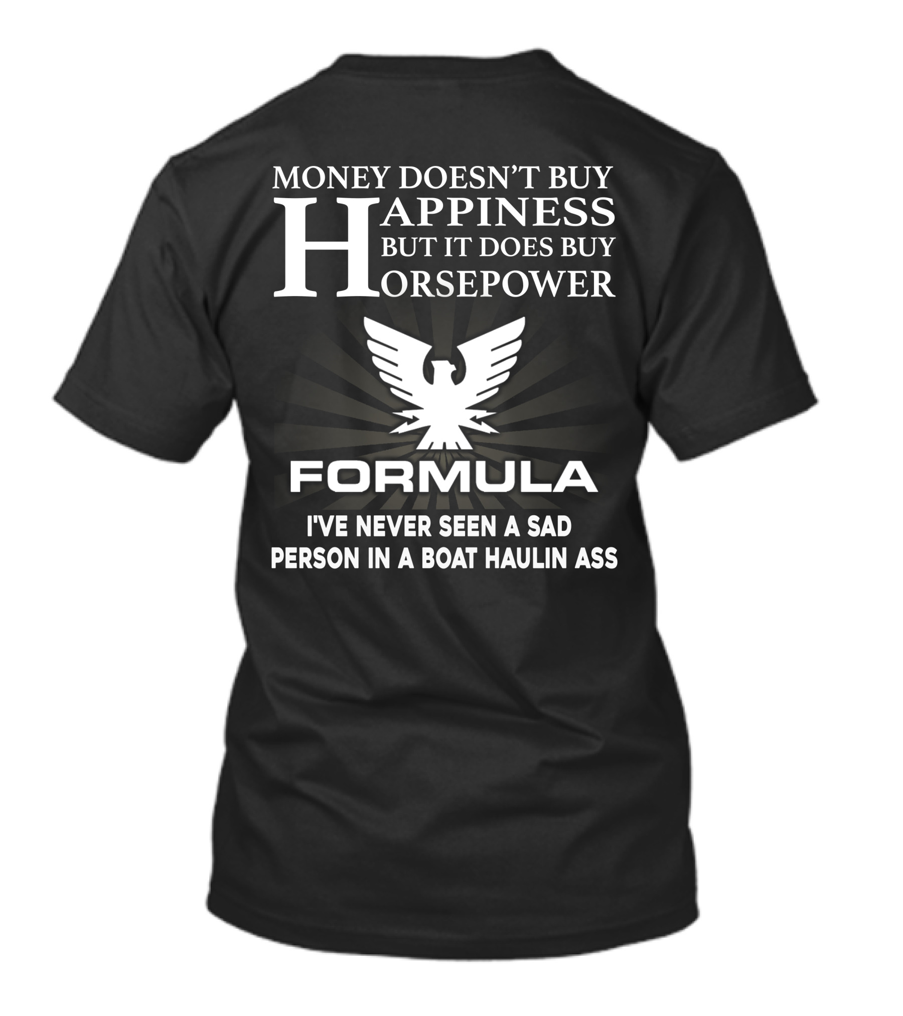 FORMULA MONEY DOESN'T BUY HAPPINESS BUT IT DOES BUY HORSEPOWER I'VE NEVER SEEN A SAD PERSON IN A BOAT HAULIN ASS T-Shirt