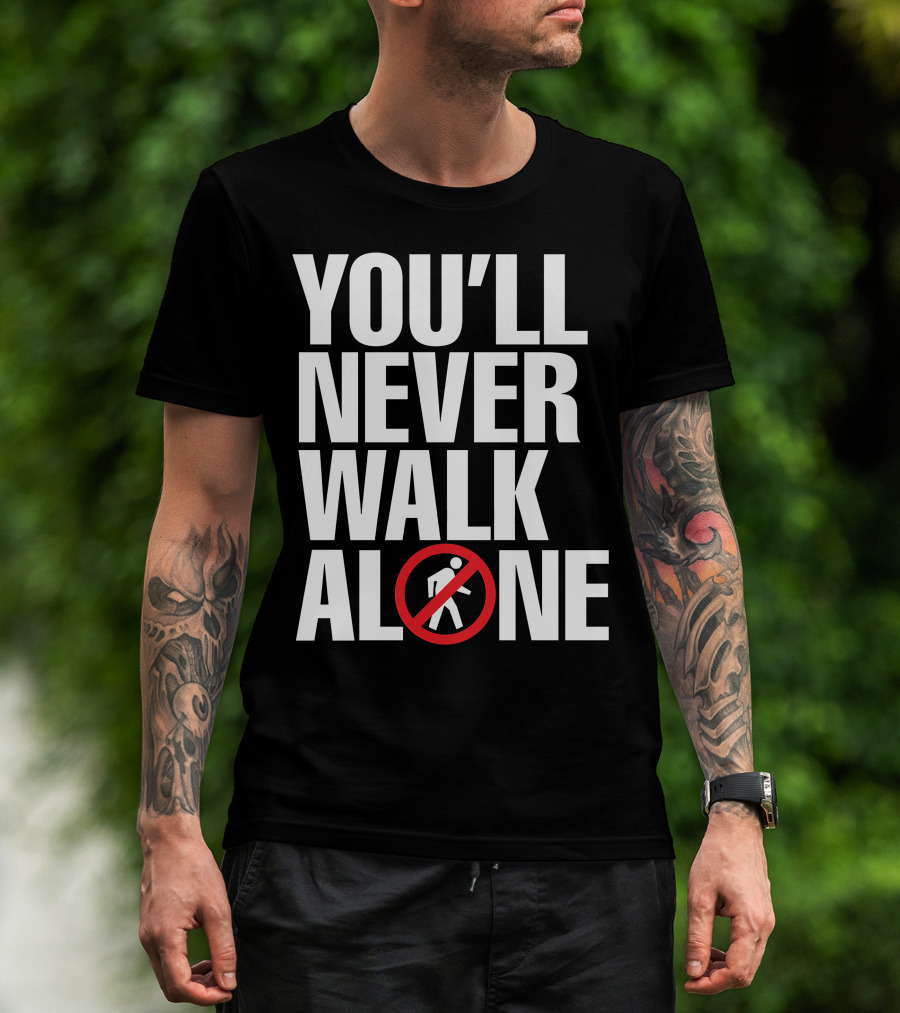 The You'll Never Walk Stop Sign T-shirt is designed for everyday wear and a consistent fit. Fabric is pre-shrunk ring-spun cotton with durable stitching. See the size chart below for exact measurements.