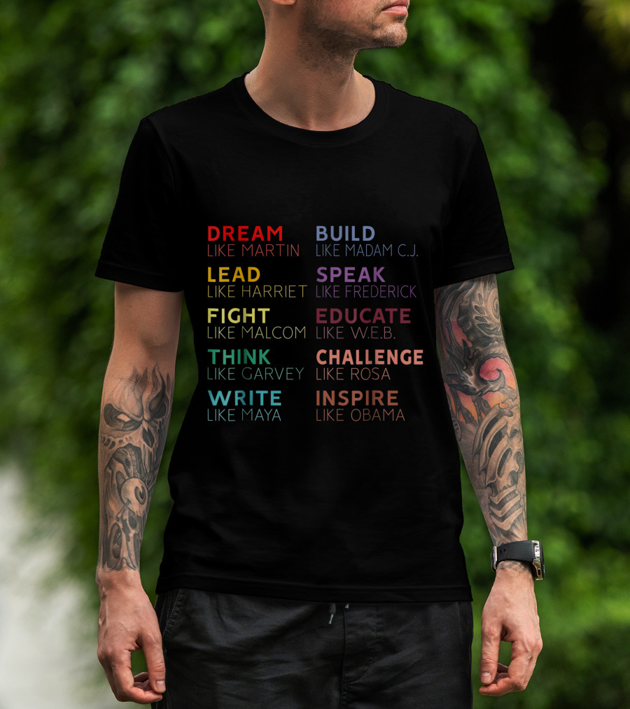 DREAM BUILD LEAD SPEAK FIGHT EDUCATE THINK CHALLENGE WRITE INSPIRE MARTIN MADAM C.J. HARRIET FREDERICK MALCOM W.E.B. GARVEY ROSA MAYA OBAMA T-Shirt