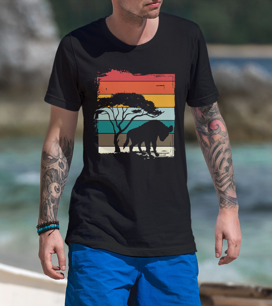 The Hyenas Safari Africa Hyena Vintage Silhouette Sunset Scene T-shirt is designed for everyday wear and a consistent fit. Fabric is pre-shrunk ring-spun cotton with durable stitching. See the size chart below for exact measurements.