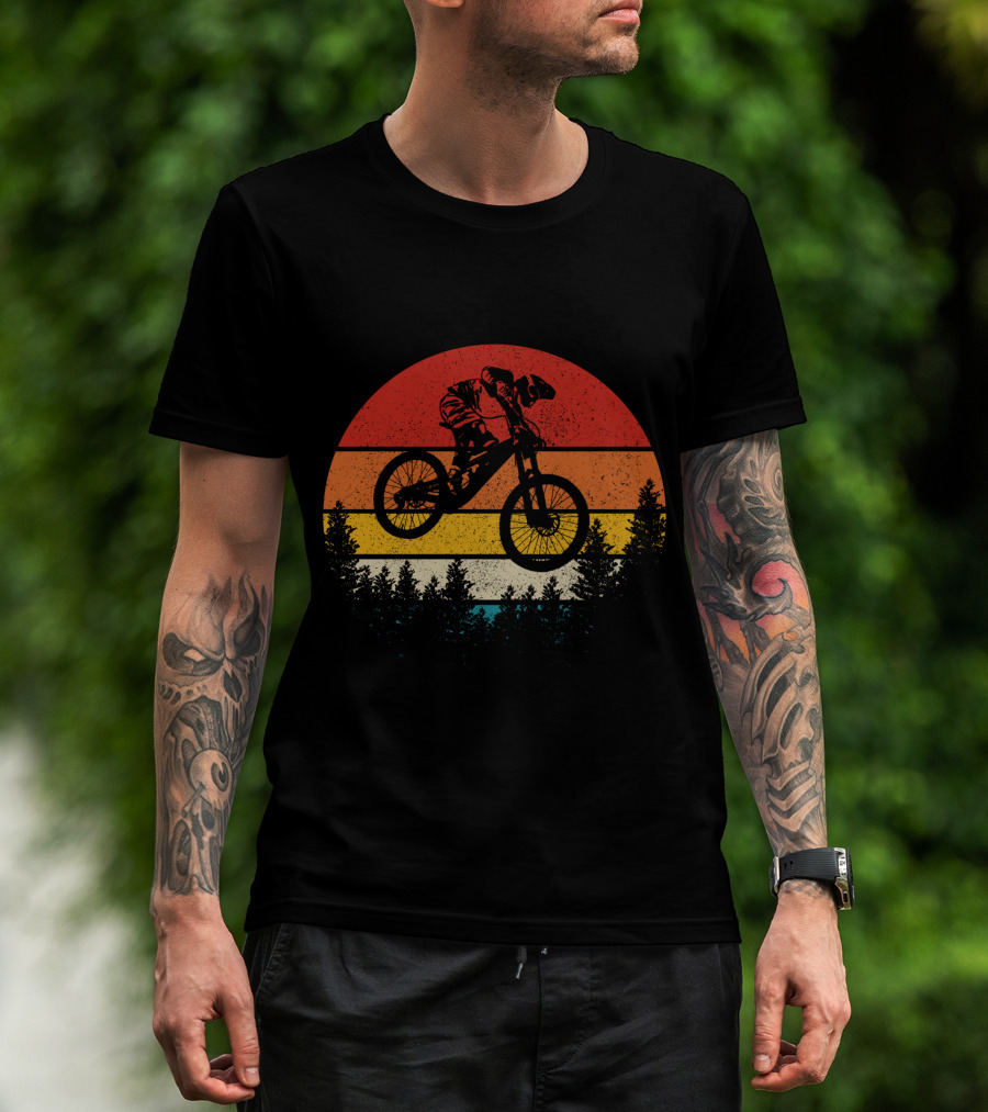 The Mountain Bike Vintage Retro Downhill Sunset Forest T-shirt is designed for everyday wear and a consistent fit. Fabric is pre-shrunk ring-spun cotton with durable stitching. See the size chart below for exact measurements.