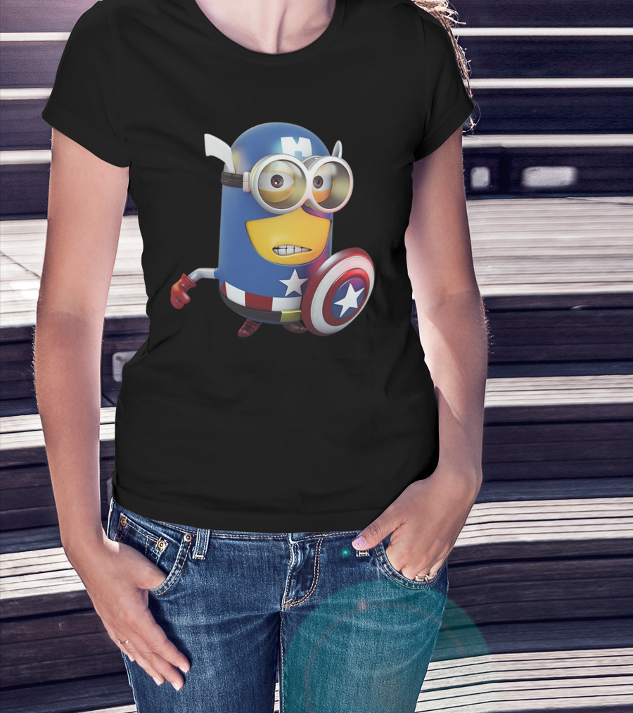 The Minion Captain America T-shirt is designed for everyday wear and a consistent fit. Fabric is pre-shrunk ring-spun cotton with durable stitching. See the size chart below for exact measurements.