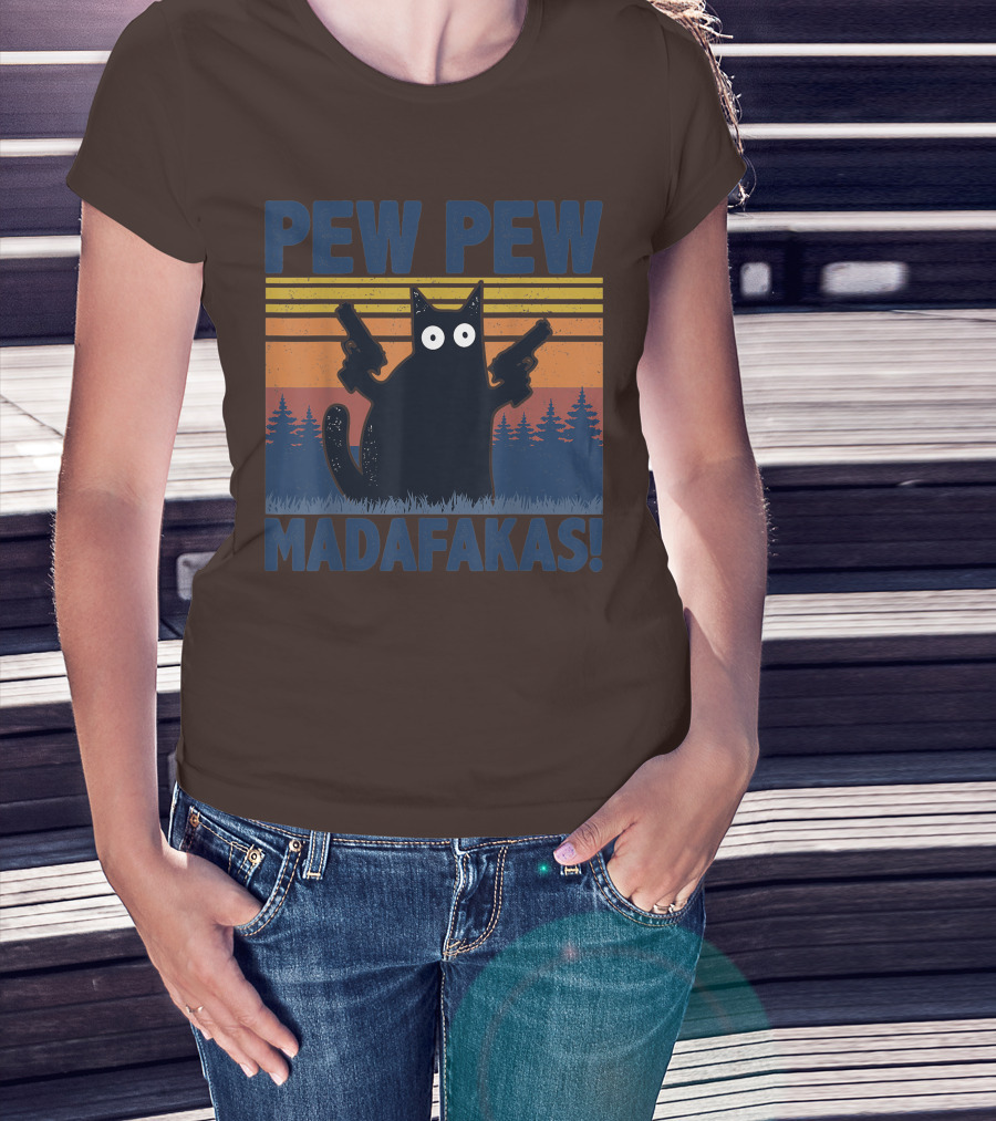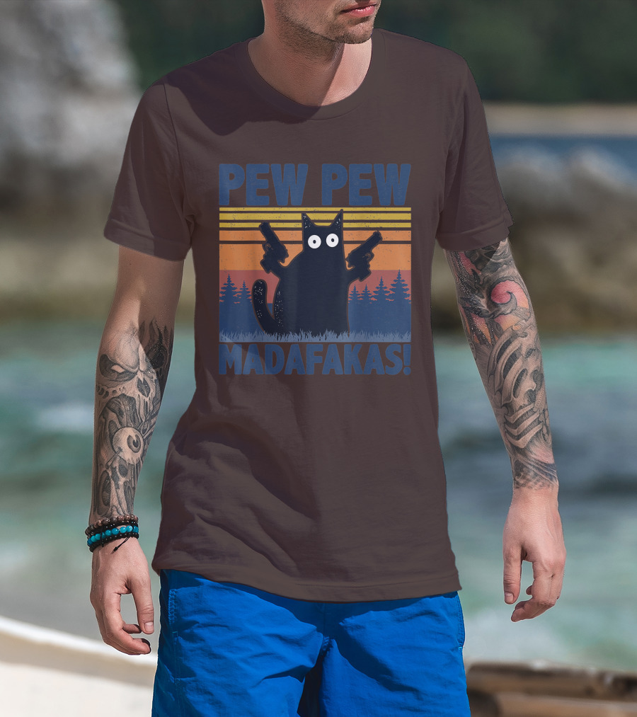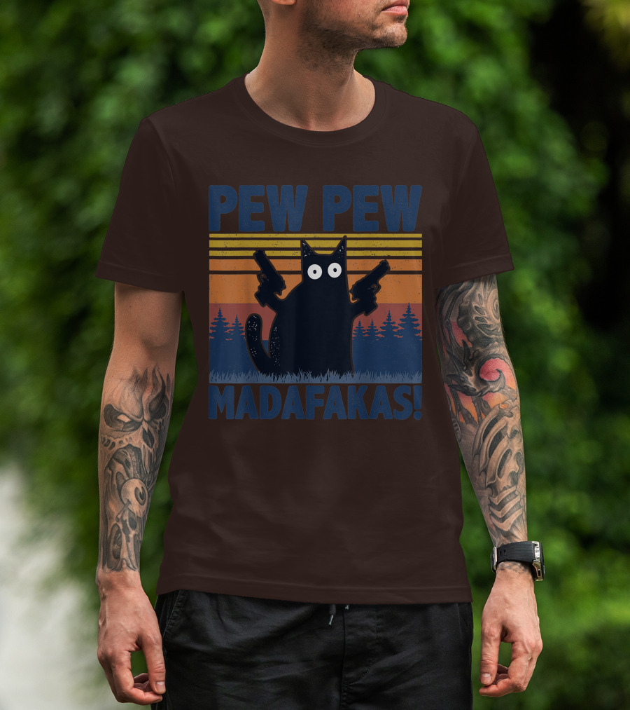 The Pew Pew Madafakas Funny Vintage Cat with Guns Retro Forest Background T-shirt is designed for everyday wear and a consistent fit. Fabric is pre-shrunk ring-spun cotton with durable stitching. See the size chart below for exact measurements.