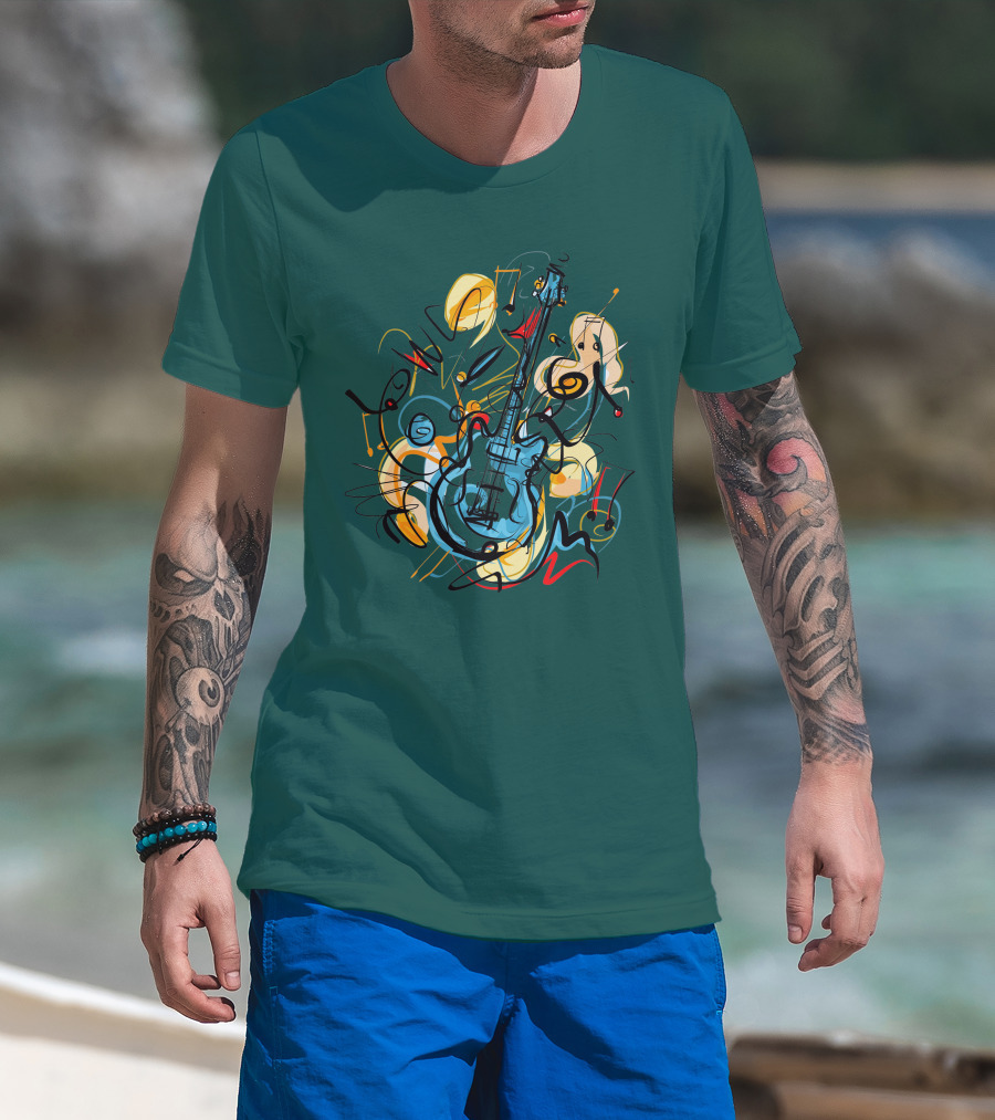 The Guitar Music Love Vibrant Abstract Composition T-shirt is designed for everyday wear and a consistent fit. Fabric is pre-shrunk ring-spun cotton with durable stitching. See the size chart below for exact measurements.