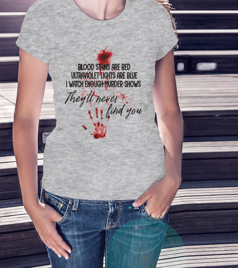 Blood Stains Are Red Ultraviolet Lights Are Blue I Watch Enough Murder Shows They'll Never Find You Handprint T-Shirt