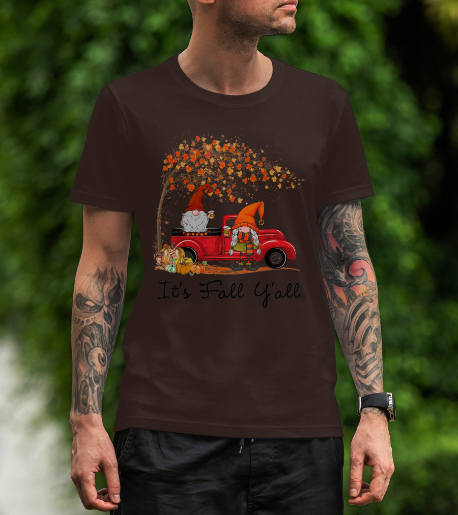 It's Fall Y'all Cute Gnomes Pumpkin Autumn Tree Fall Leaves Red Truck T-Shirt