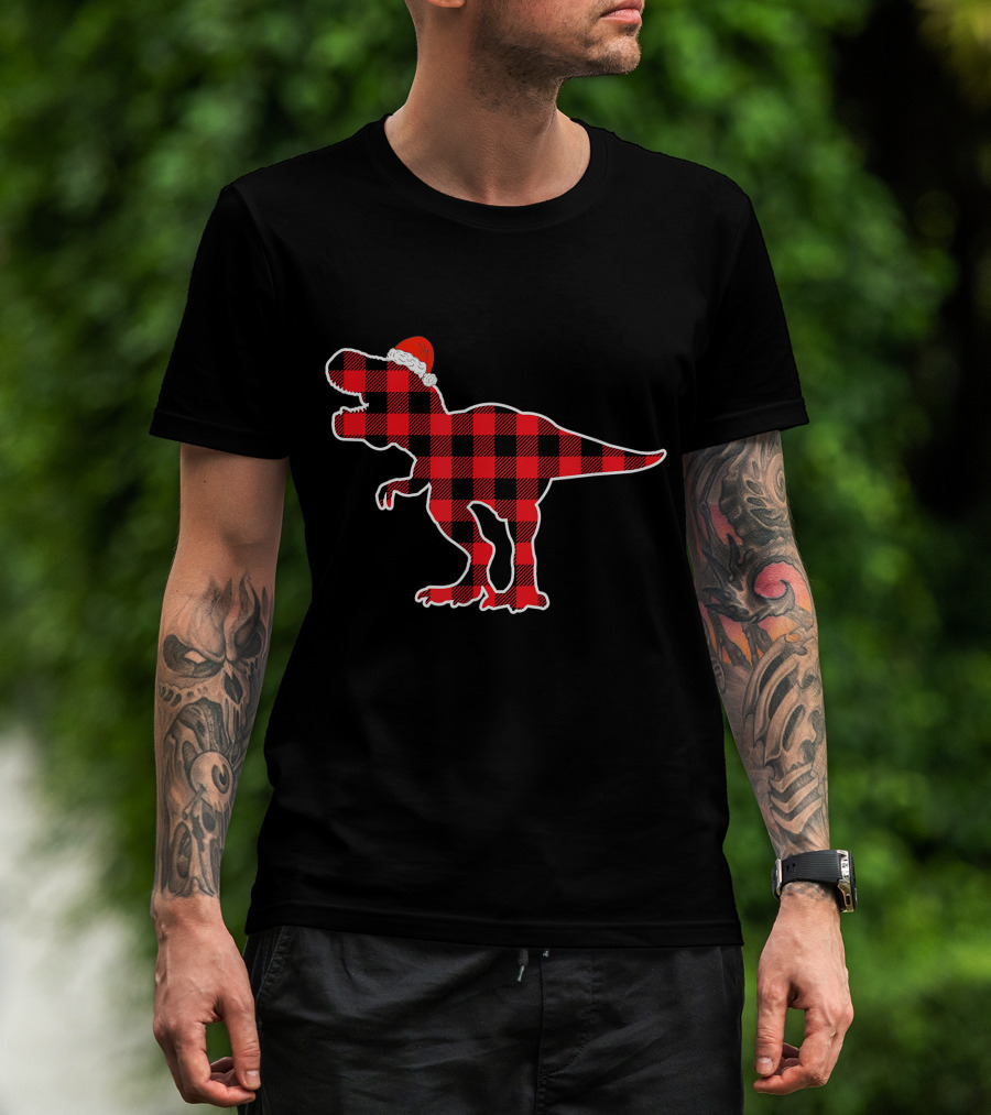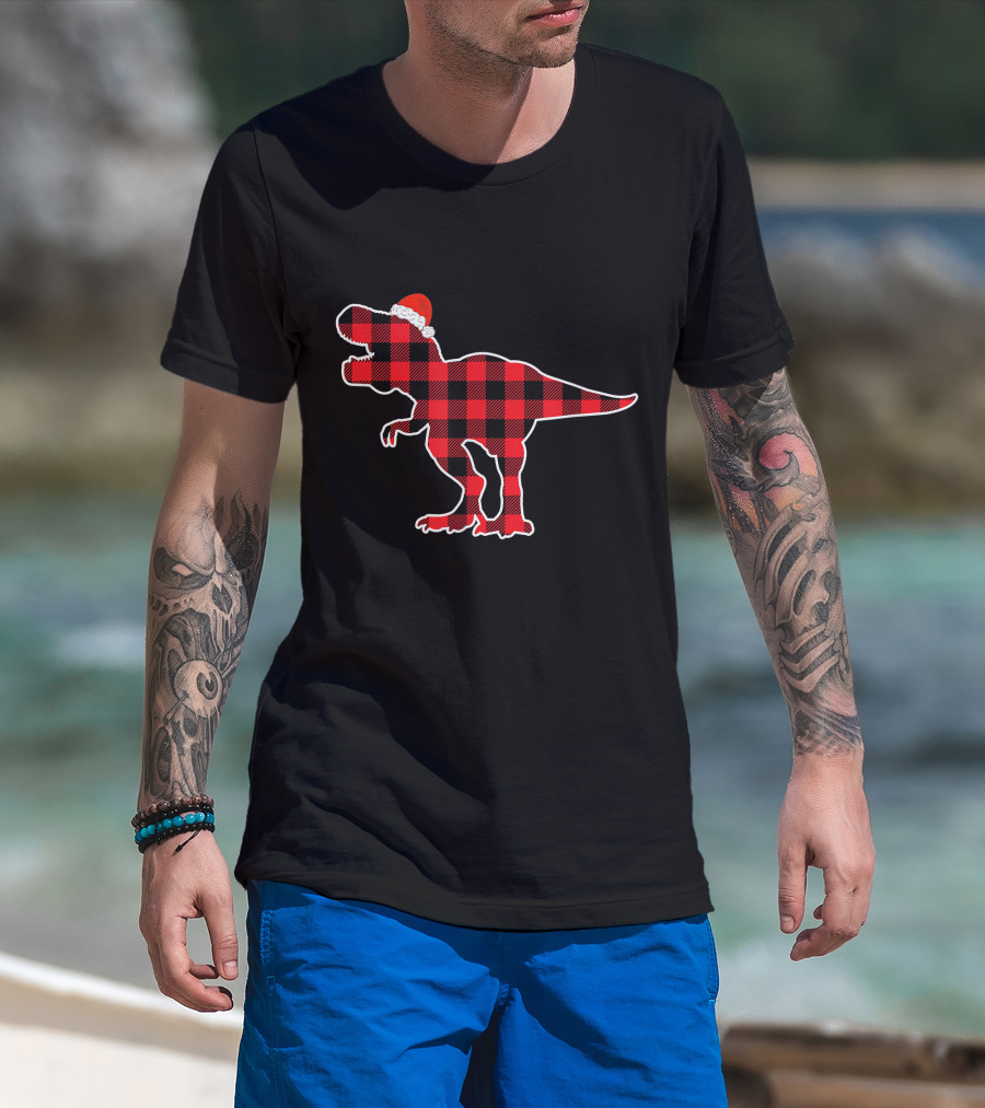 Red Plaid Dinosaur Wearing Santa Hat T-Shirt