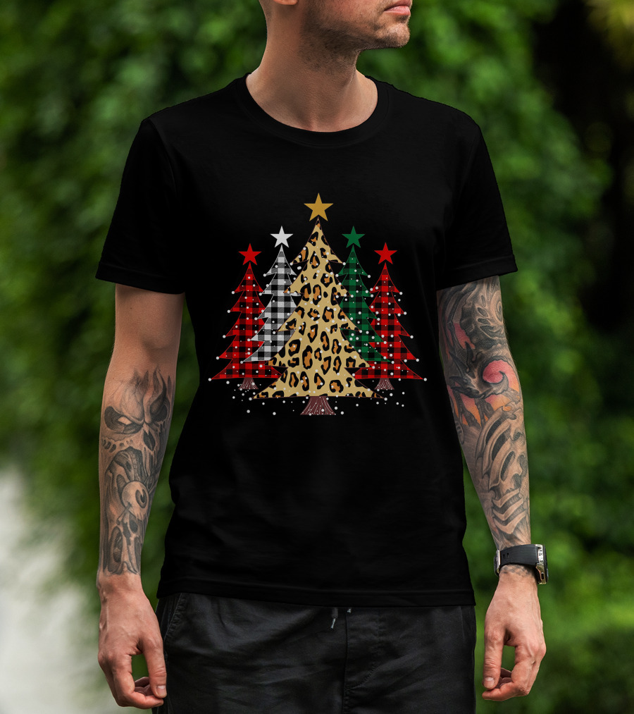 Merry Christmas Trees Buffalo Plaid Leopard Stars Holiday T-Shirt