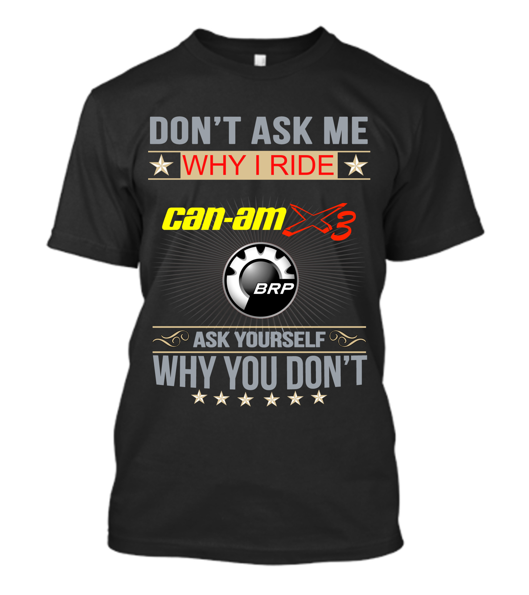The DON'T ASK ME WHY I RIDE CAN-AM X3 BRP ASK YOURSELF WHY YOU DON'T T-shirt is designed for everyday wear and a consistent fit. Fabric is pre-shrunk ring-spun cotton with durable stitching. See the size chart below for exact measurements.