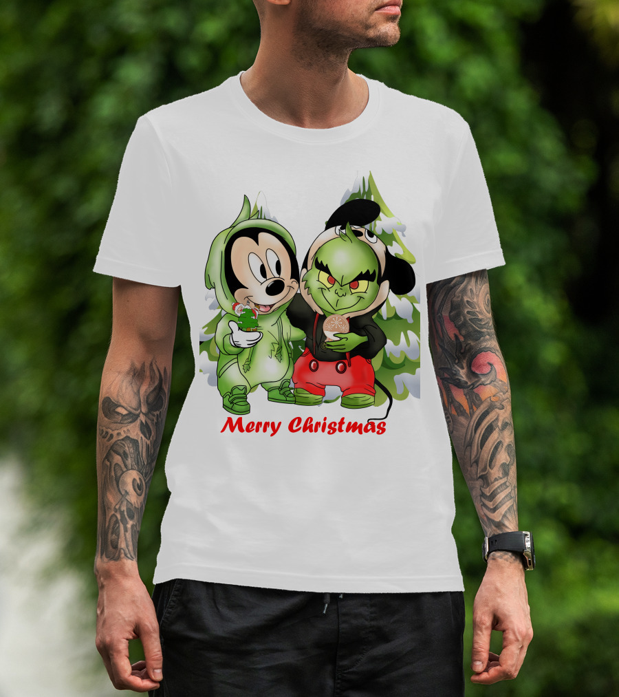The Merry Christmas The Grinch and Mickey T-shirt is designed for everyday wear and a consistent fit. Fabric is pre-shrunk ring-spun cotton with durable stitching. See the size chart below for exact measurements.