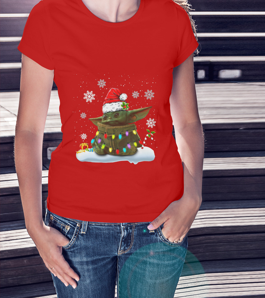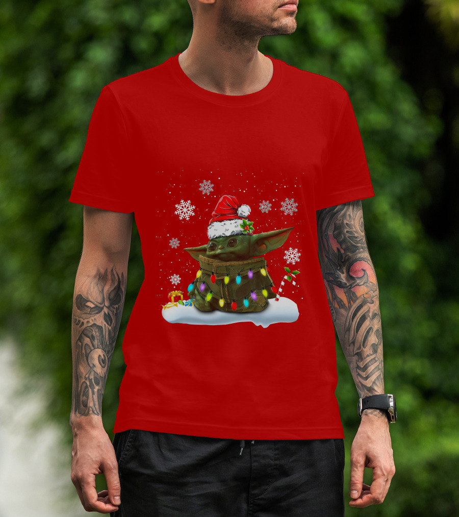 The Santa Baby Yoda Christmas Lights Snowflakes Candy Cane Holiday Scene T-shirt is designed for everyday wear and a consistent fit. Fabric is pre-shrunk ring-spun cotton with durable stitching. See the size chart below for exact measurements.