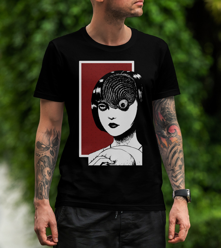 The Junji Ito Uzumaki The Great Spiral Horror Manga Face with Spiral Eye T-shirt is designed for everyday wear and a consistent fit. Fabric is pre-shrunk ring-spun cotton with durable stitching. See the size chart below for exact measurements.