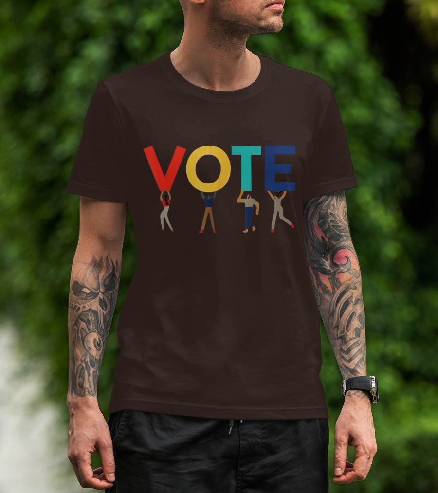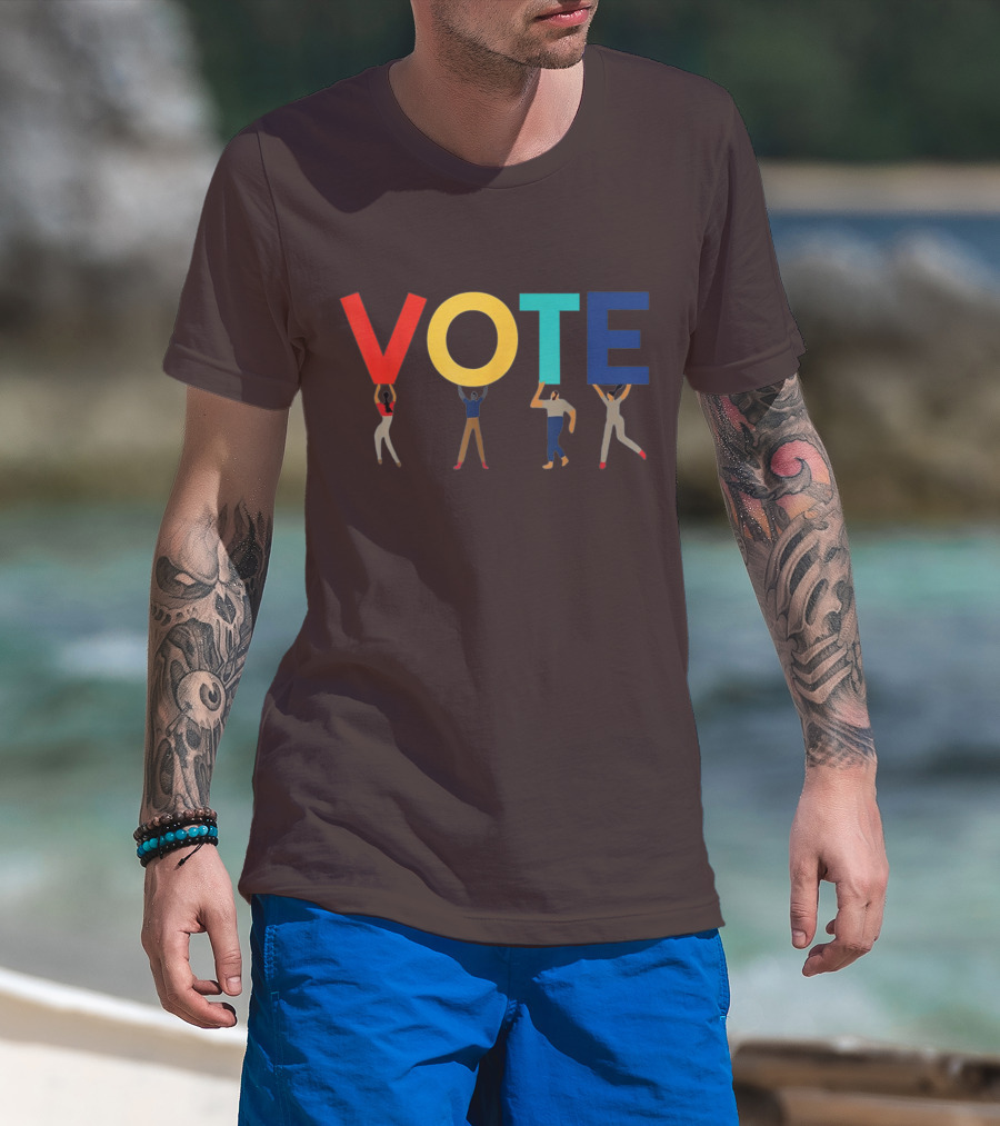 The VOTE Patriotic United Colors Representation T-shirt is designed for everyday wear and a consistent fit. Fabric is pre-shrunk ring-spun cotton with durable stitching. See the size chart below for exact measurements.