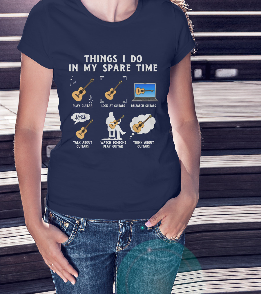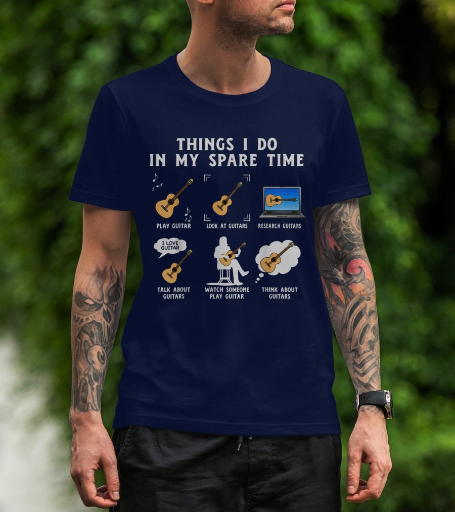 The Things I Do In My Spare Time Guitar Lover Play Look Research Talk Watch Think T-shirt is designed for everyday wear and a consistent fit. Fabric is pre-shrunk ring-spun cotton with durable stitching. See the size chart below for exact measurements.