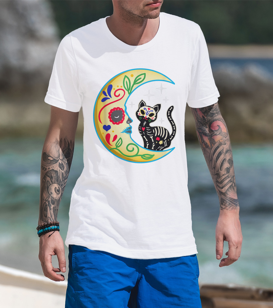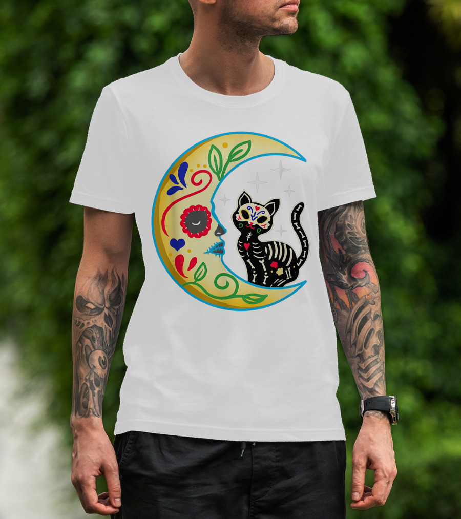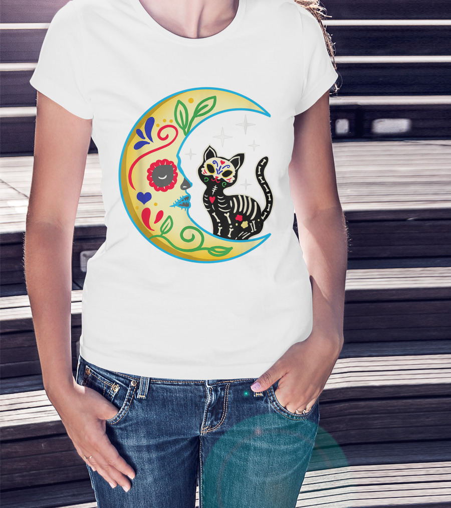 Cat And Moon Sugar Skull Dia De Los Muertos Day Of The Dead Mexican Festival T-Shirt